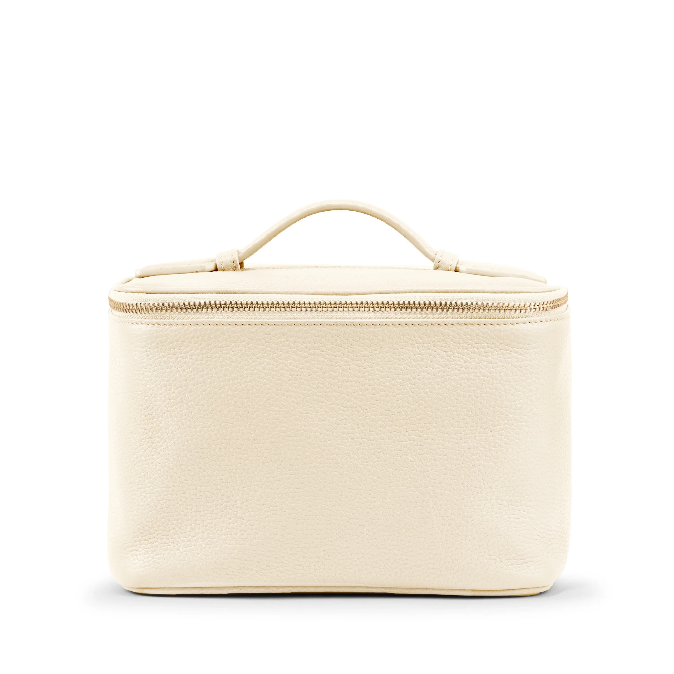 The Small Train Case offers compact yet structured storage for travel-size beauty essentials. Similar in design to the Medium Train Case, it accommodates bottles flat or upright within water-resistant lined pockets. Interior zippered compartments help keep smaller items secure, making it an organized solution for limited counter space or carry-on travel.